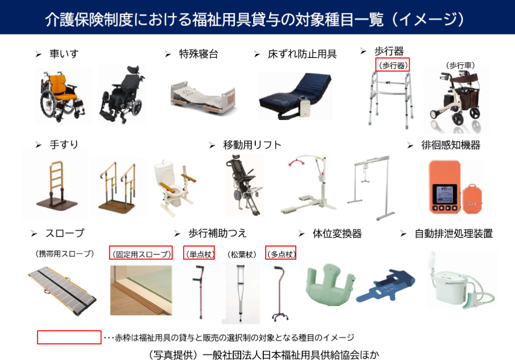歩行器(歩行車は除く)、歩行補助つえ、固定用スロープについては、令和6年度からレンタルするか福祉用具として購入するか、利用者が選べるようになりました。